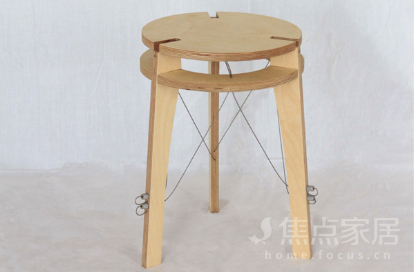 设计理念来源于中国传统的“孔明锁”。凳子仅有3个腿,3根绳子和2个圆,无需工具即可组装。自然状态下,凳子呈松散状态,只有和“坐”这个动作结合,凳子才非常坚固。